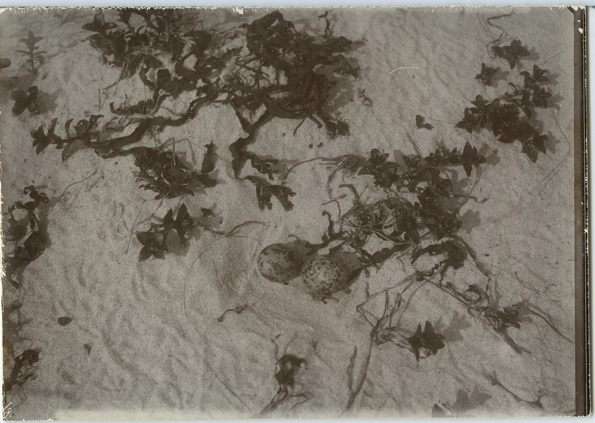 Silvertärna, bo med 2 ägg. Sand och tång. Närbild.