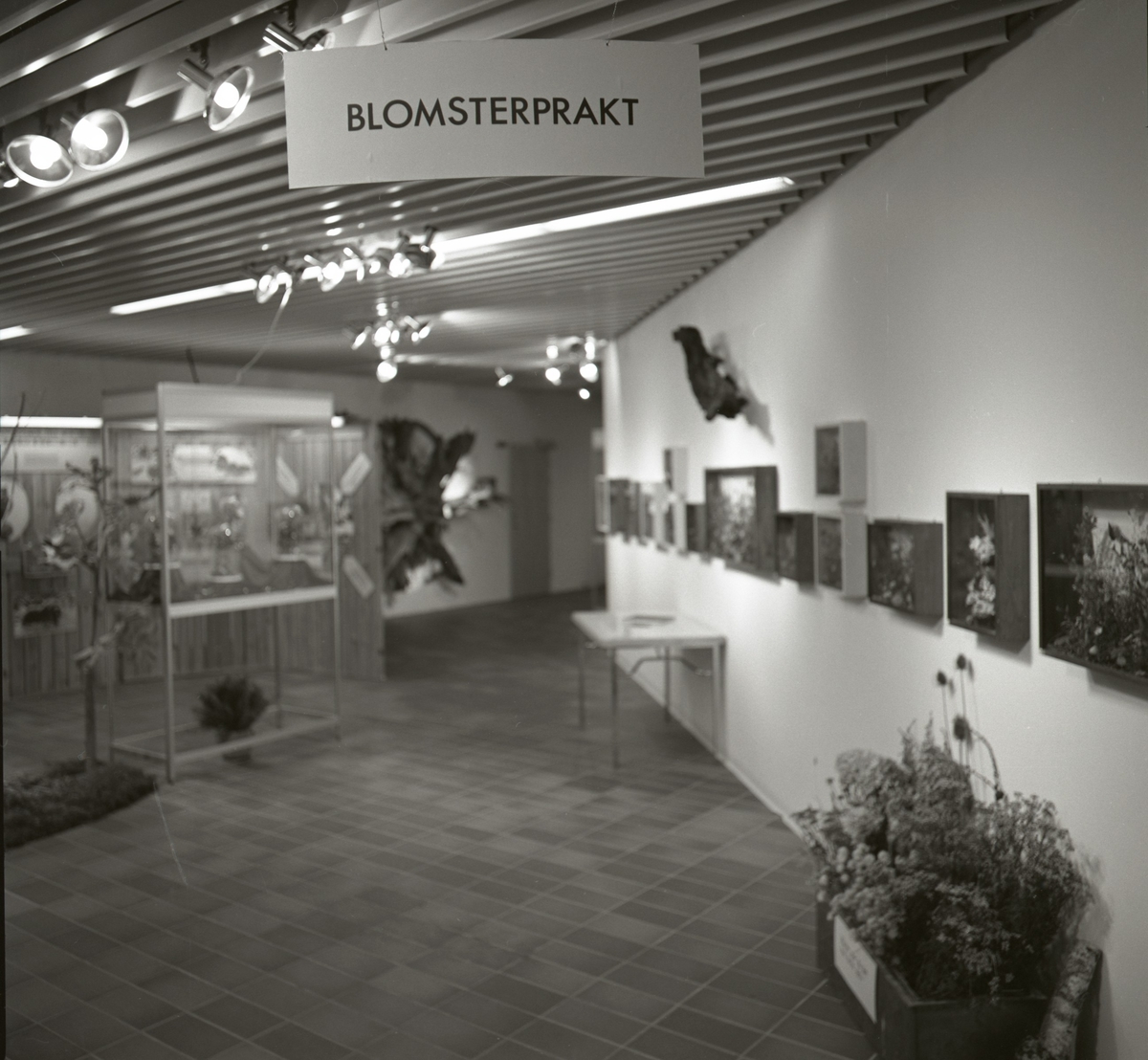 'Utställningen ''Blomsterprakt''. :: :: Blomsterarrangemang, på väggen tavlor, tittskåp med blommor, växter. Till vänster skymtar utställningen ''Viltet genom 150 år''. :: :: Ingår i serie med fotonr. 5797:1-7.'