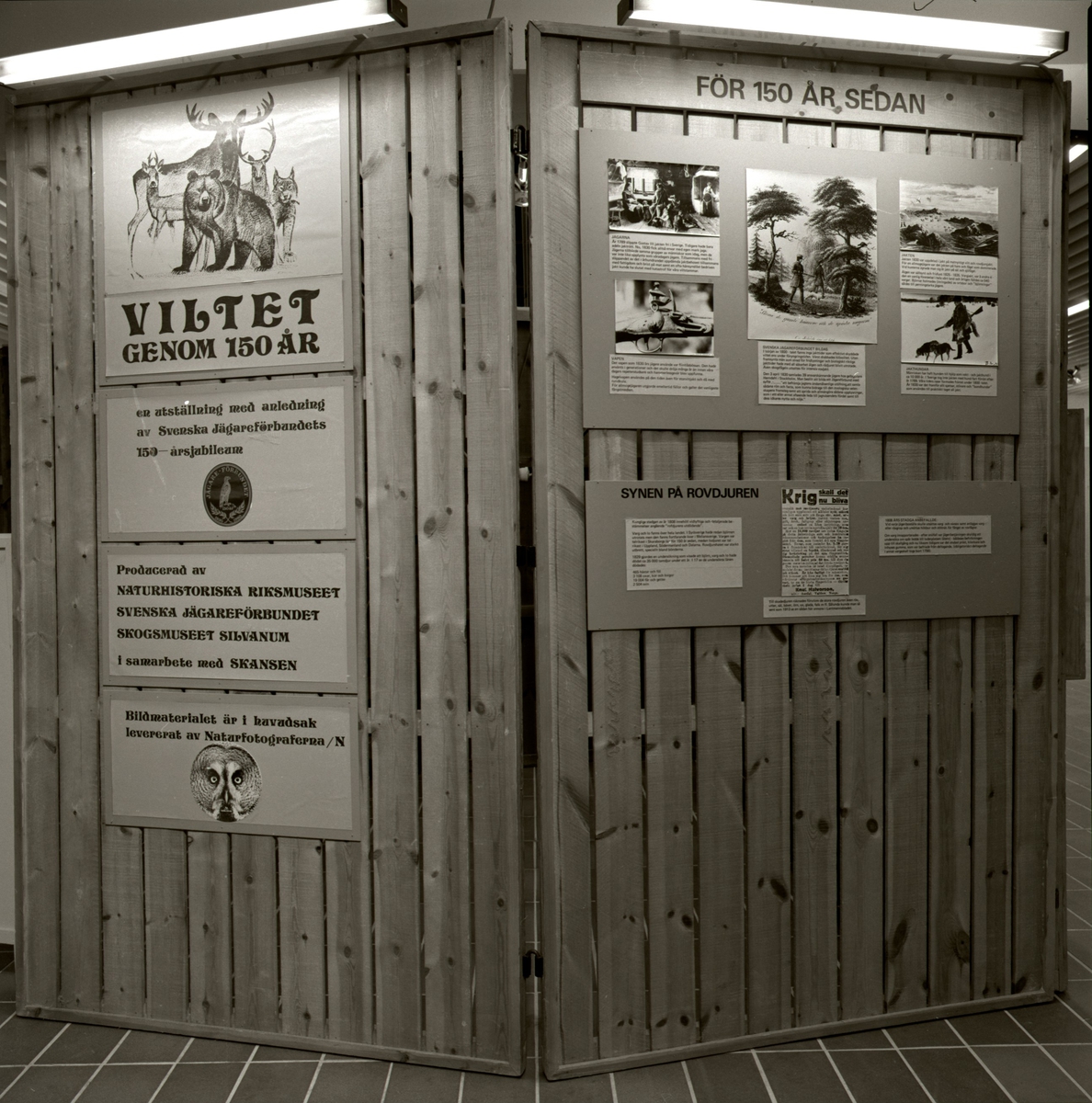 'Utställningen '' Viltet genom 150 år'' från Riksmuseet: :: :: Utställningsskärmar med bilder och texter med rubriker ''Viletet genom 150 år'' och ''För 150 år sedan''. :: :: Ingår i serie med fotonr. 5796:1-12.'