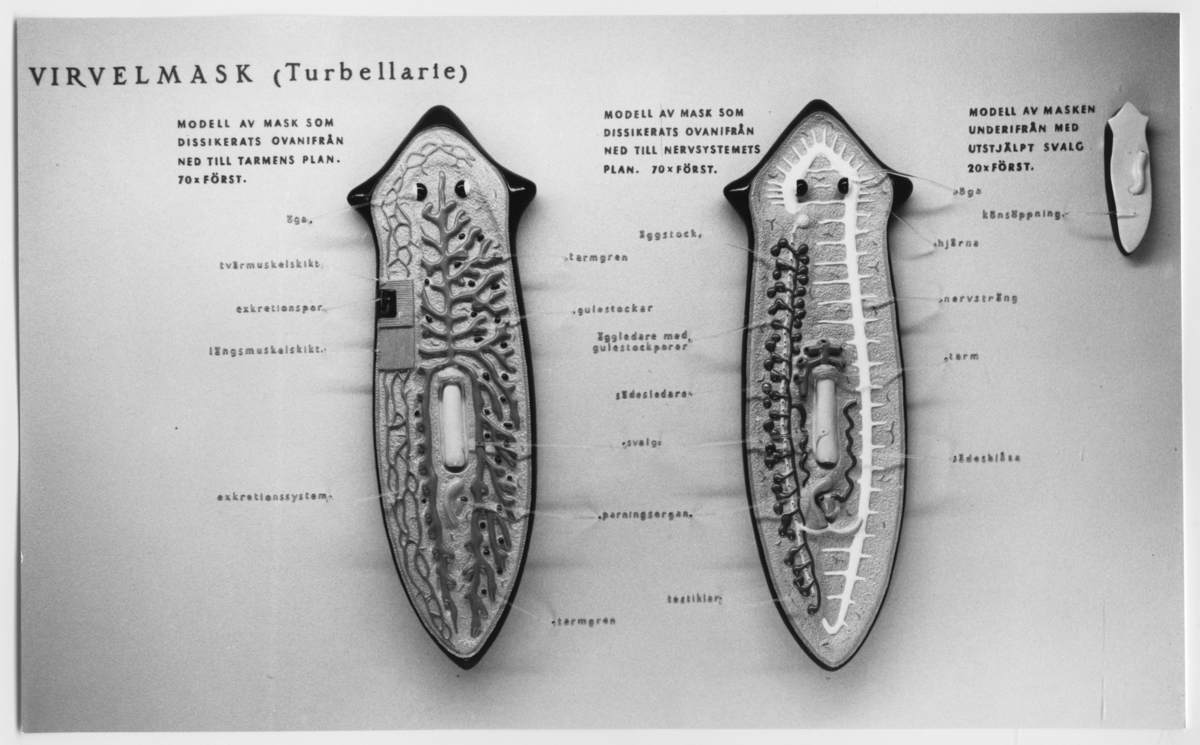 'Bilder från Göteborgs Naturhistoriska museum tagna som övningsuppgift av fotografer på Göteborgs Stads yrkesskolor: :: :: 2 st modeller av virvelmask, dissikerad ned till tarmens plan resp. dissikerad ned till nervsystemets plan, 70 ggr förstoring. Organens namn utsatta. :: :: Ingår i serie med fotonr. 6953:1-53.'