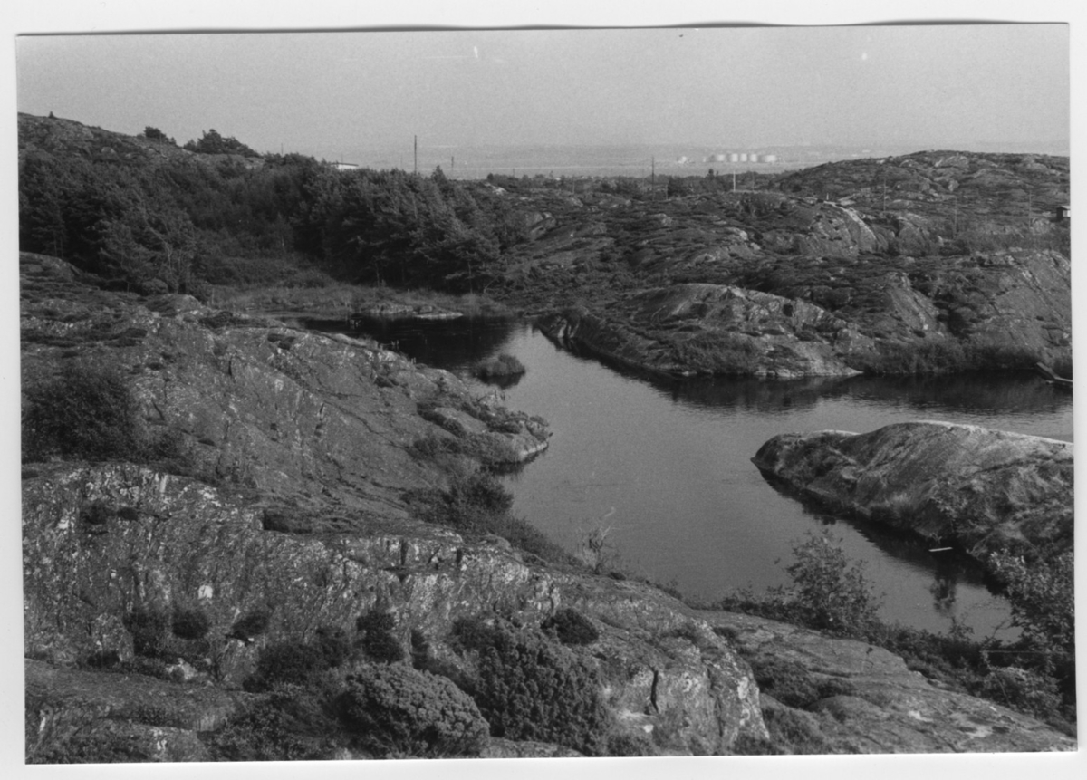 'Bildtext: ''Sjö i klippbäcken. Riktning 110.'' Vy med klippbäcken med enbuskar på berghäll och i fonden fabriksbyggnader. :: :: Ingår i serie med fotonr. 6970:1-1125, dokumentation av Hisingens naturgeografi, visande landskapsformerna i stora drag och gjord inför exploateringen av området. Platserna för fotograferingen finns utsatta på karta i skala 1:4000 som finns på Göteborgs Naturhistoriska musem. Fotoriktningen mättes med kompass i gammalgrader.'
