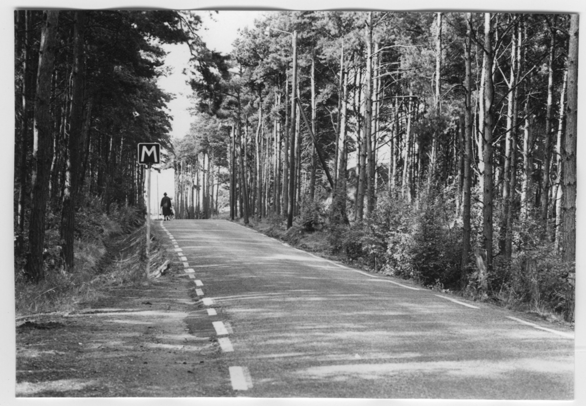 'Bildtext: ''Dunge med tallvegetation i spricka. Riktning 250.'' Asfaltsväg med tallskog på båda sidor. Vägskylt för mötesplats vid vägkanten och människor gående på vägen. :: :: Ingår i serie med fotonr. 6970:1-1125, dokumentation av Hisingens naturgeografi, visande landskapsformerna i stora drag och gjord inför exploateringen av området. Platserna för fotograferingen finns utsatta på karta i skala 1:4000 som finns på Göteborgs Naturhistoriska musem. Fotoriktningen mättes med kompass i gammalgrader.'