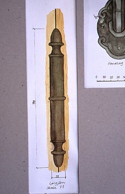 'Foton, teckningar och modeller av studenter från Chalmers Tekniska högskola, Institutionen för Arkitekturhistoria, Göteborg. Foton och teckningar av detaljer från Naturhistoriska museets byggader, byggnadsvård. :: Gångjärn. :: :: Ingår i serie med fotonr. 6929:1-21.'