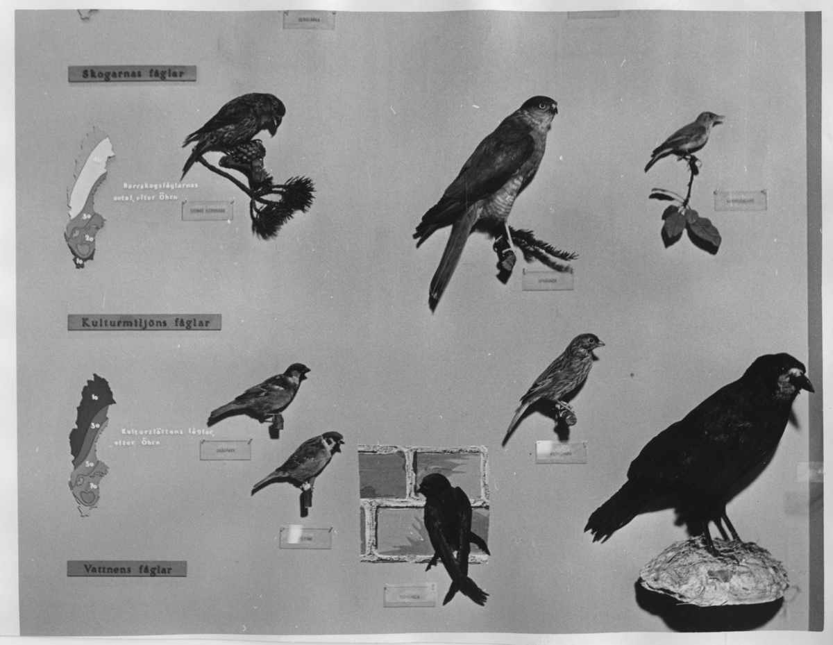 'Utställningsmonter: ''Fjällhedens fåglar'' 4 st fåglar, ''Skogarnas fåglar'' 3 st fåglar och Kulturmiljöns fåglar''. :: :: Ingår i serie med fotonr. 6959:1-21.'