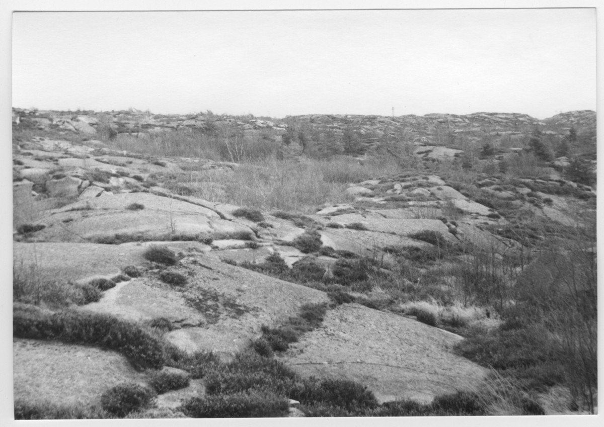 'Bildtext: ''Hällparti. Riktning 166.'' :: Vy över berghällsparti med ljung och i sprickor björk. :: :: Ingår i serie med fotonr. 6970:1-1125, dokumentation av Hisingens naturgeografi, visande landskapsformerna i stora drag och gjord inför exploateringen av området. Platserna för fotograferingen finns utsatta på karta i skala 1:4000 som finns på Göteborgs Naturhistoriska musem. Fotoriktningen mättes med kompass i gammalgrader.'