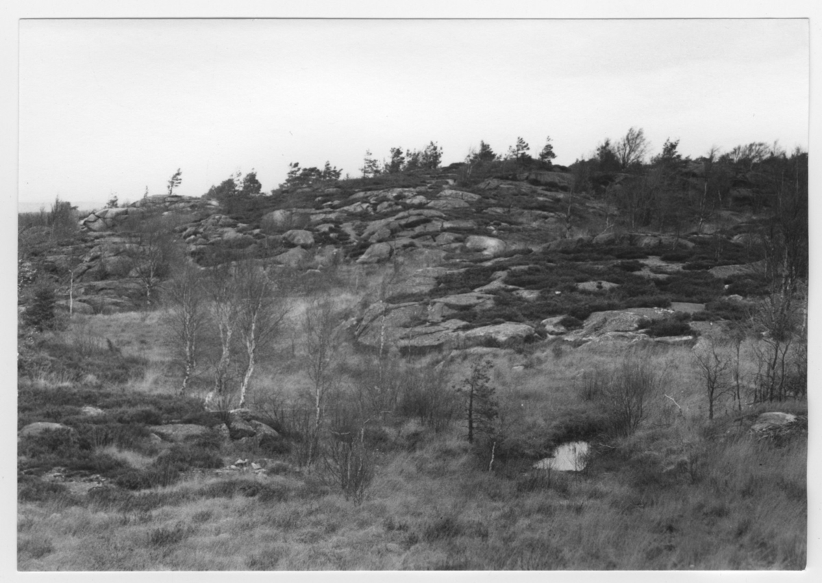 'Bildtext: ''Hällandskap med kärr. Riktning 349.'' :: I förgrunden kärret med liten vattenspegel. Vy med berghäll med ljung och björk. :: :: Ingår i serie med fotonr. 6970:1-1125, dokumentation av Hisingens naturgeografi, visande landskapsformerna i stora drag och gjord inför exploateringen av området. Platserna för fotograferingen finns utsatta på karta i skala 1:4000 som finns på Göteborgs Naturhistoriska musem. Fotoriktningen mättes med kompass i gammalgrader.'