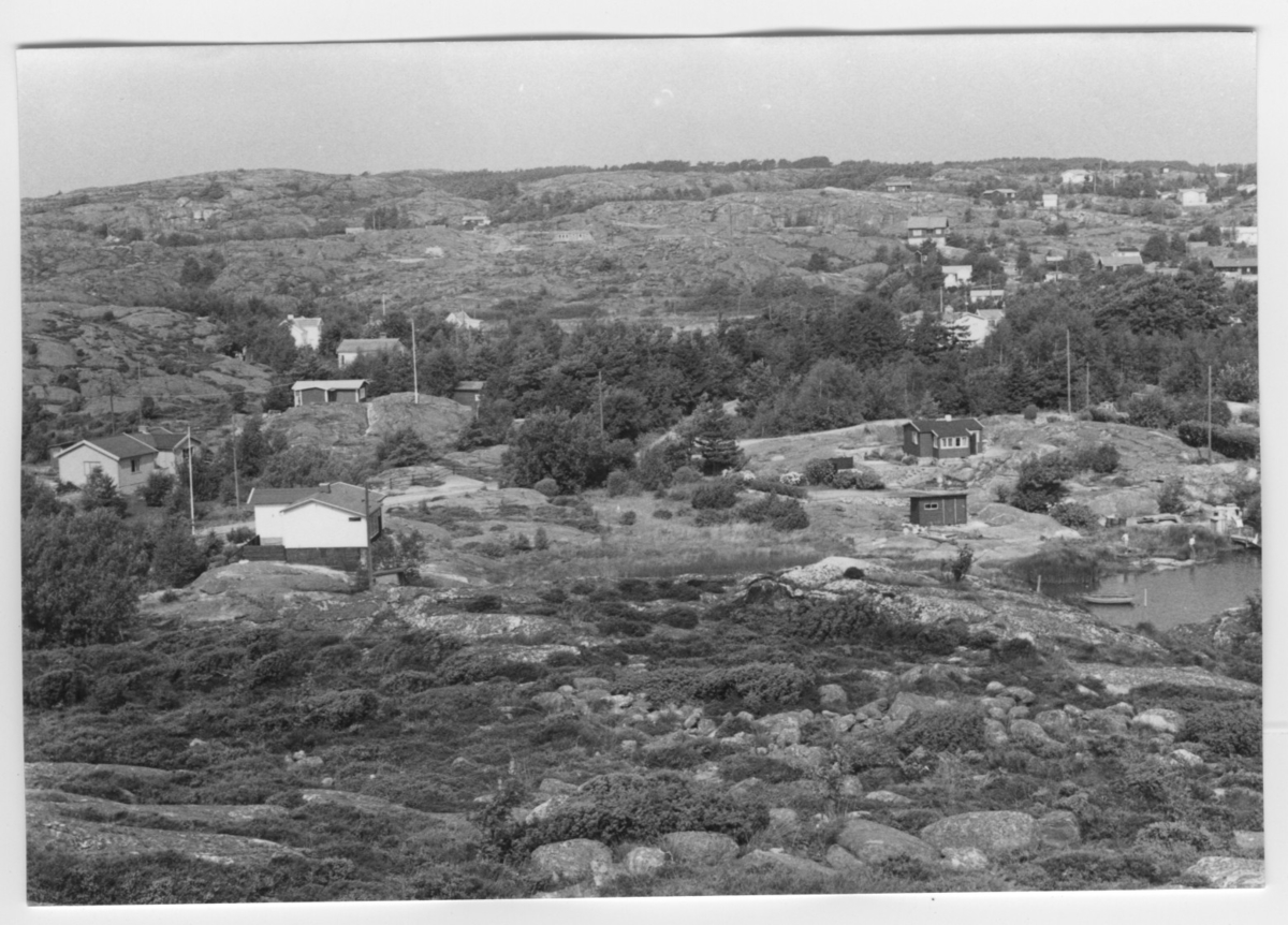 'Bildtext: ''Hällandskap med långsmal havsvik. Riktning 330.'' Vy över berghällar med spridda hus. Liten eka i vattnet. Krypande enebuskar. :: :: Ingår i serie med fotonr. 6970:1-1125, dokumentation av Hisingens naturgeografi, visande landskapsformerna i stora drag och gjord inför exploateringen av området. Platserna för fotograferingen finns utsatta på karta i skala 1:4000 som finns på Göteborgs Naturhistoriska musem. Fotoriktningen mättes med kompass i gammalgrader.'