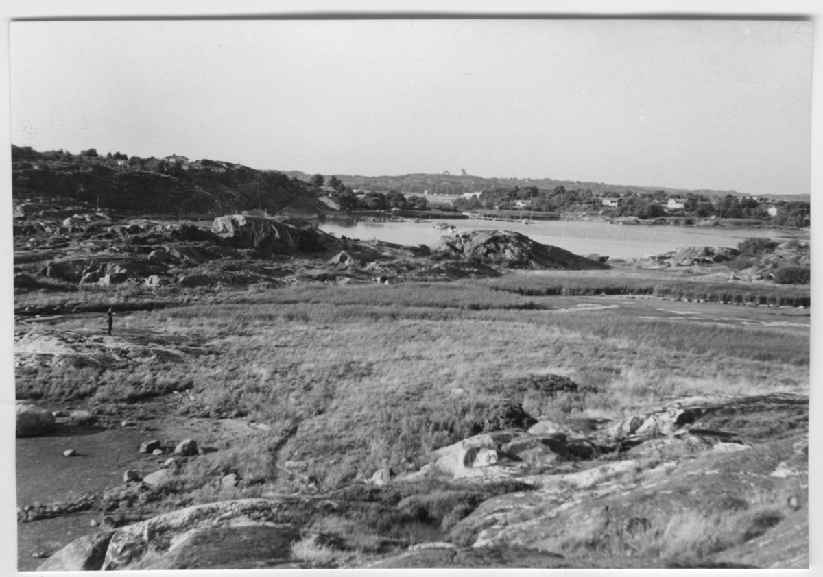 'Bildtext: ''Igenväxande havsvik. Riktning 10.'' I förgrunden igenväxning, vass. Vy med viss bebyggelse :: :: Ingår i serie med fotonr. 6970:1-1125, dokumentation av Hisingens naturgeografi, visande landskapsformerna i stora drag och gjord inför exploateringen av området. Platserna för fotograferingen finns utsatta på karta i skala 1:4000 som finns på Göteborgs Naturhistoriska musem. Fotoriktningen mättes med kompass i gammalgrader.'