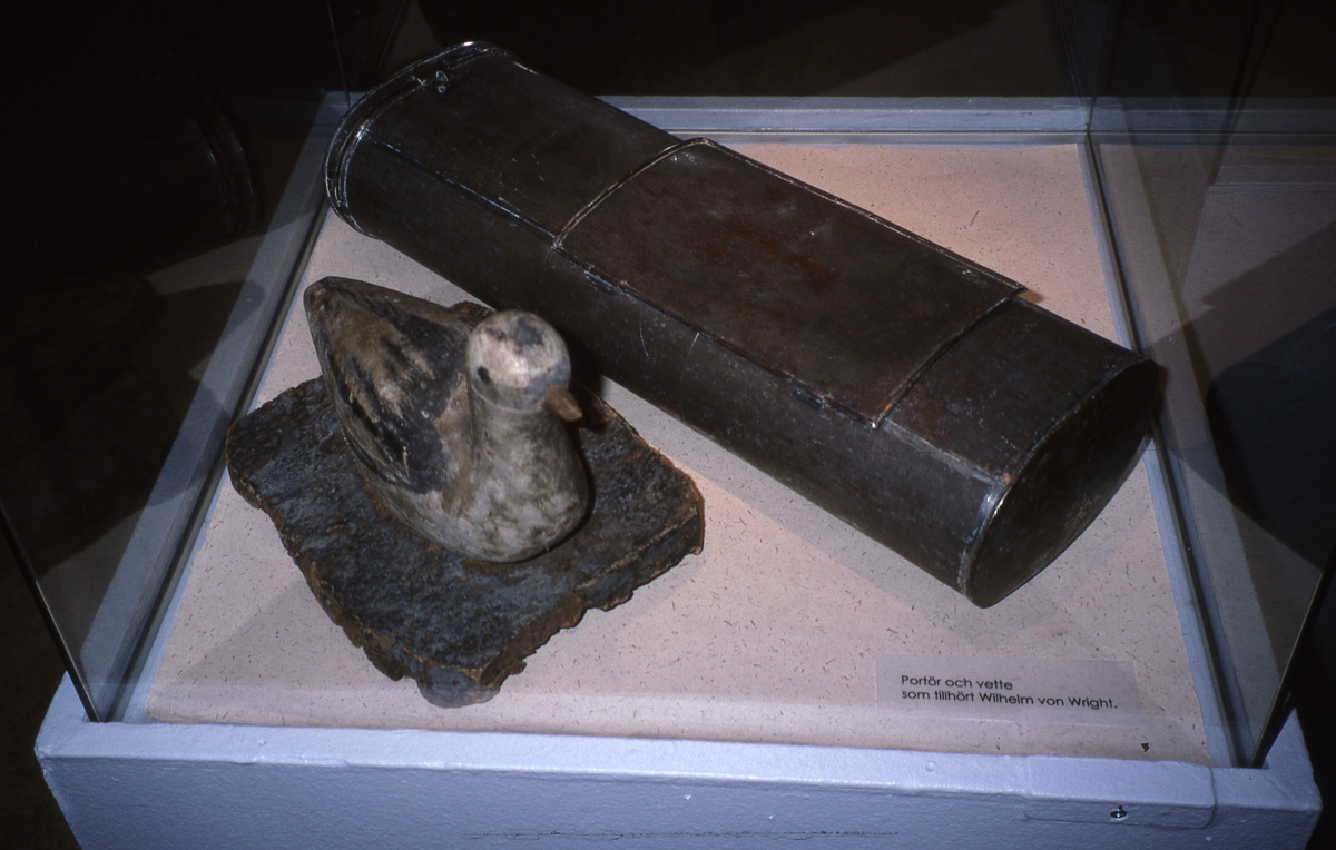 'Motiv av utställningen om konstnärsbröderna von Wright på Göteborgs Naturhistoriska museum: :: :: Glasmonter med ''Portär och vette''. :: :: Ingår i serie med fotonr. 6938:1-35.'