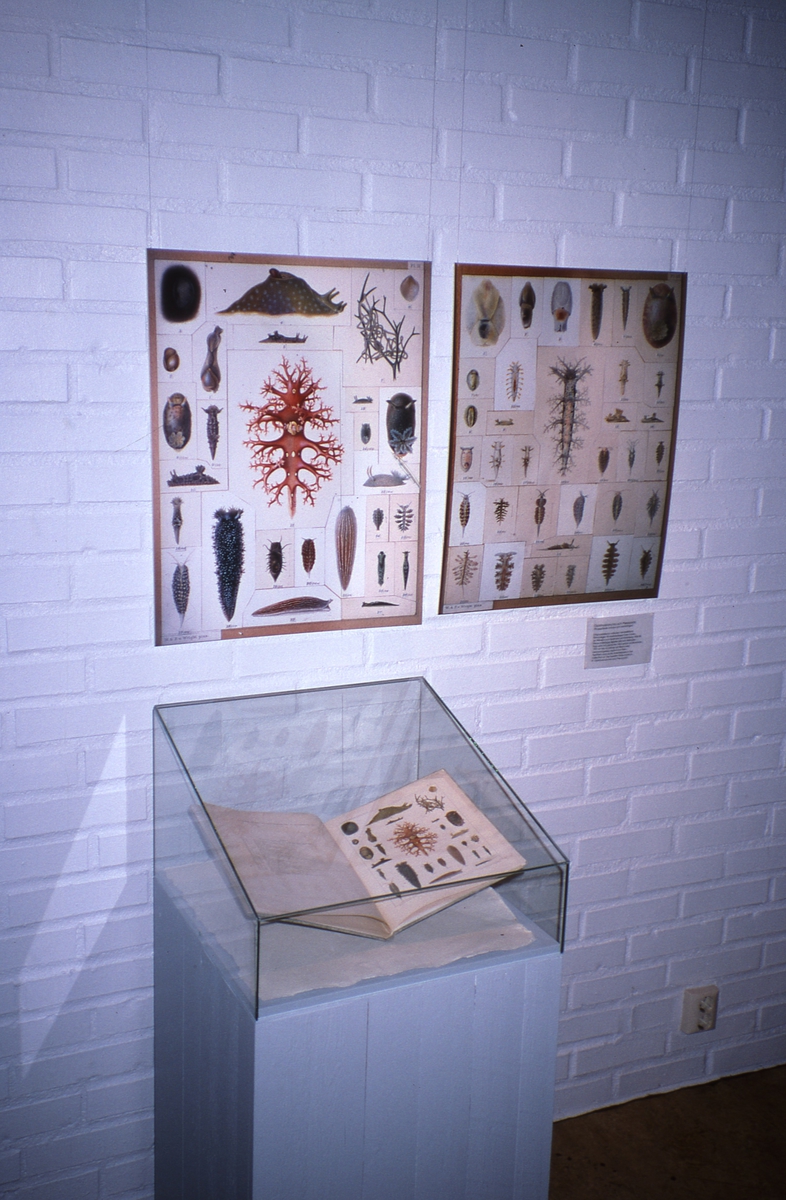 'Motiv av utställningen om konstnärsbröderna von Wright på Göteborgs Naturhistoriska museum: :: :: Glasmonter samt affisch på väggen. :: :: Ingår i serie med fotonr. 6938:1-35.'