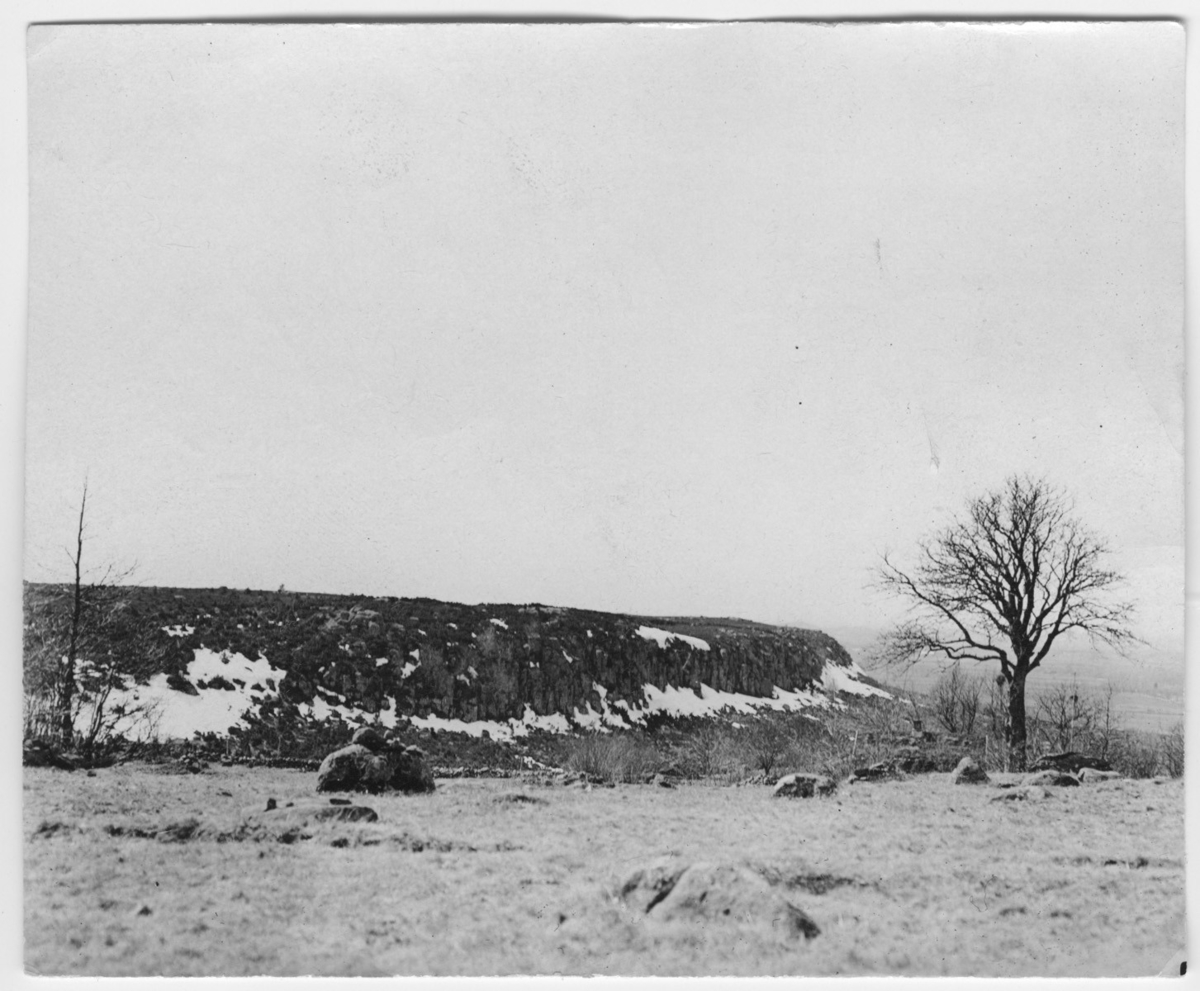 'Sörberget där orrspelet pågick. Vy med berg, träd och i förgrunden öppen mark med stenblock. :: :: Se även fotonr. 687-691.'