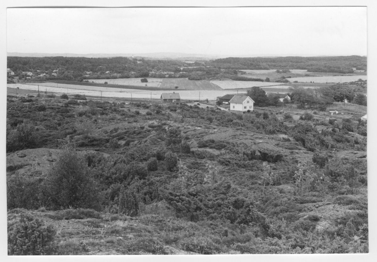 'Bildtext: ''Sedimentyta. Riktning 44.'' I förgrunden berghäll med enbuskar och björk. Vy ut över hus och öppna fält, åkrar. I fonden hus och trädvegetation. :: :: Ingår i serie med fotonr. 6970:1-1125, dokumentation av Hisingens naturgeografi, visande landskapsformerna i stora drag och gjord inför exploateringen av området. Platserna för fotograferingen finns utsatta på karta i skala 1:4000 som finns på Göteborgs Naturhistoriska musem. Fotoriktningen mättes med kompass i gammalgrader.'