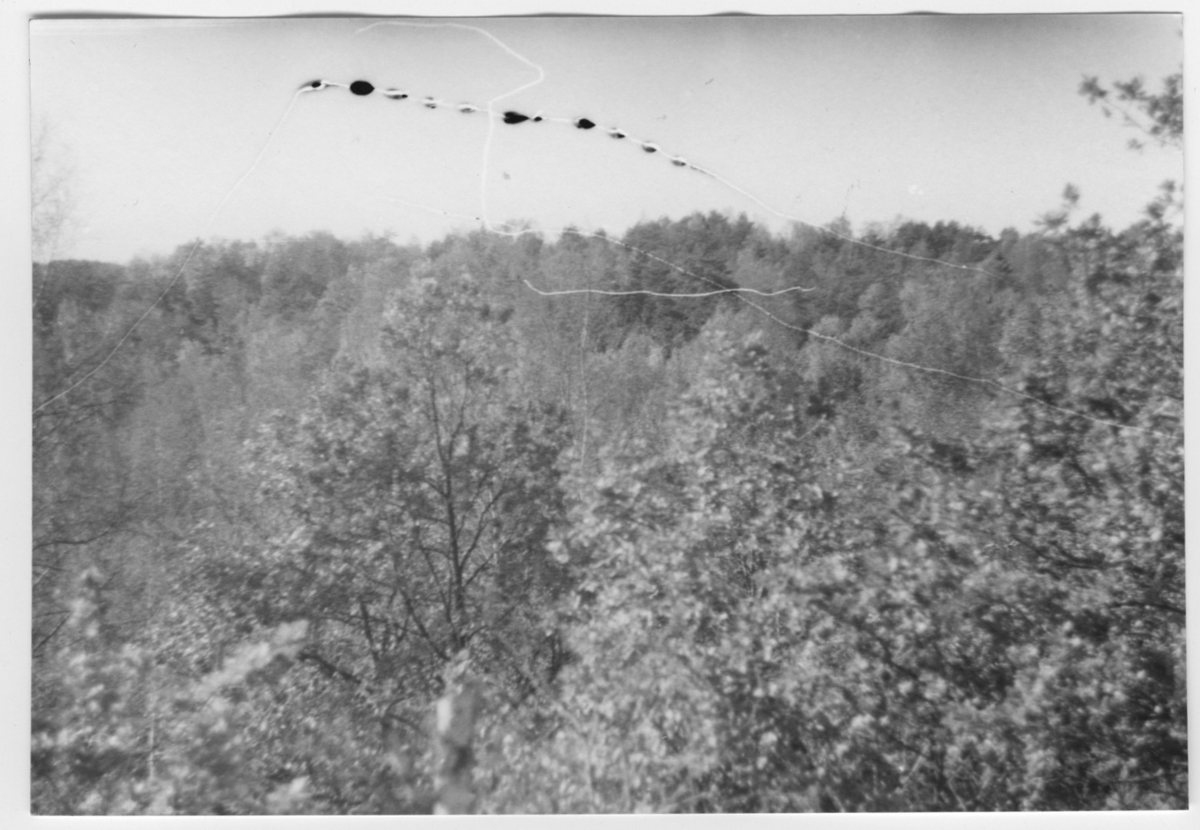 'Bildtext: ''Skogsområde. Riktning 220.'' :: Vy över trädtoppar. Suddig bild. :: :: Ingår i serie med fotonr. 6970:1-1125, dokumentation av Hisingens naturgeografi, visande landskapsformerna i stora drag och gjord inför exploateringen av området. Platserna för fotograferingen finns utsatta på karta i skala 1:4000 som finns på Göteborgs Naturhistoriska musem. Fotoriktningen mättes med kompass i gammalgrader.'