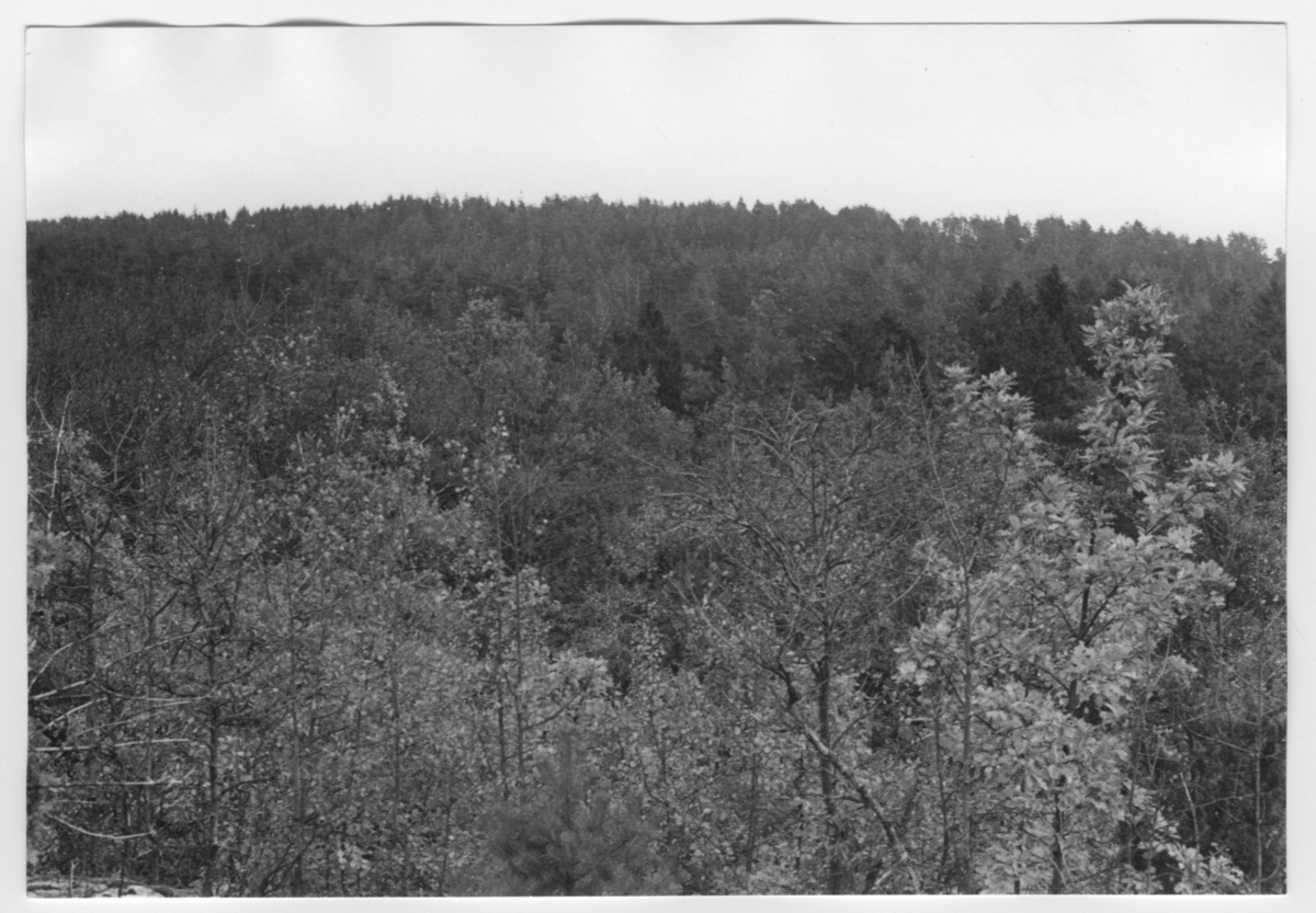 'Bildtext: ''Skogsparti. Riktning 68.'' Vy ut över skogspartiet med barrträd. :: :: Ingår i serie med fotonr. 6970:1-1125, dokumentation av Hisingens naturgeografi, visande landskapsformerna i stora drag och gjord inför exploateringen av området. Platserna för fotograferingen finns utsatta på karta i skala 1:4000 som finns på Göteborgs Naturhistoriska musem. Fotoriktningen mättes med kompass i gammalgrader.'