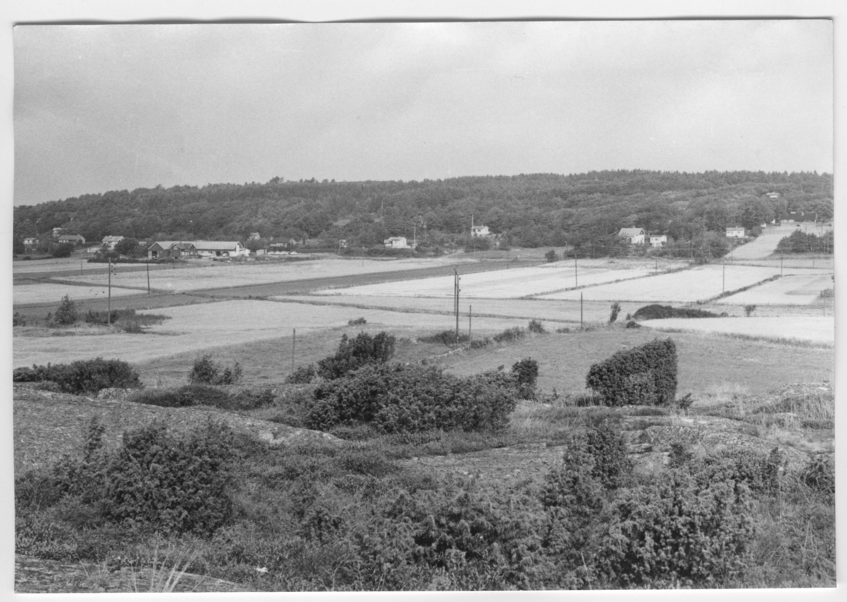 'Bildtext: ''Sedimentyta. Riktning 342.'' :: I förgrunden berghäll med enbuskar sluttande ned mot sedimentytan med öppna fält, åkrar. På andra sidan sedimentytan ligger hus i angränsning till trädbevuxna berghällar. :: :: Ingår i serie med fotonr. 6970:1-1125, dokumentation av Hisingens naturgeografi, visande landskapsformerna i stora drag och gjord inför exploateringen av området. Platserna för fotograferingen finns utsatta på karta i skala 1:4000 som finns på Göteborgs Naturhistoriska musem. Fotoriktningen mättes med kompass i gammalgrader.'