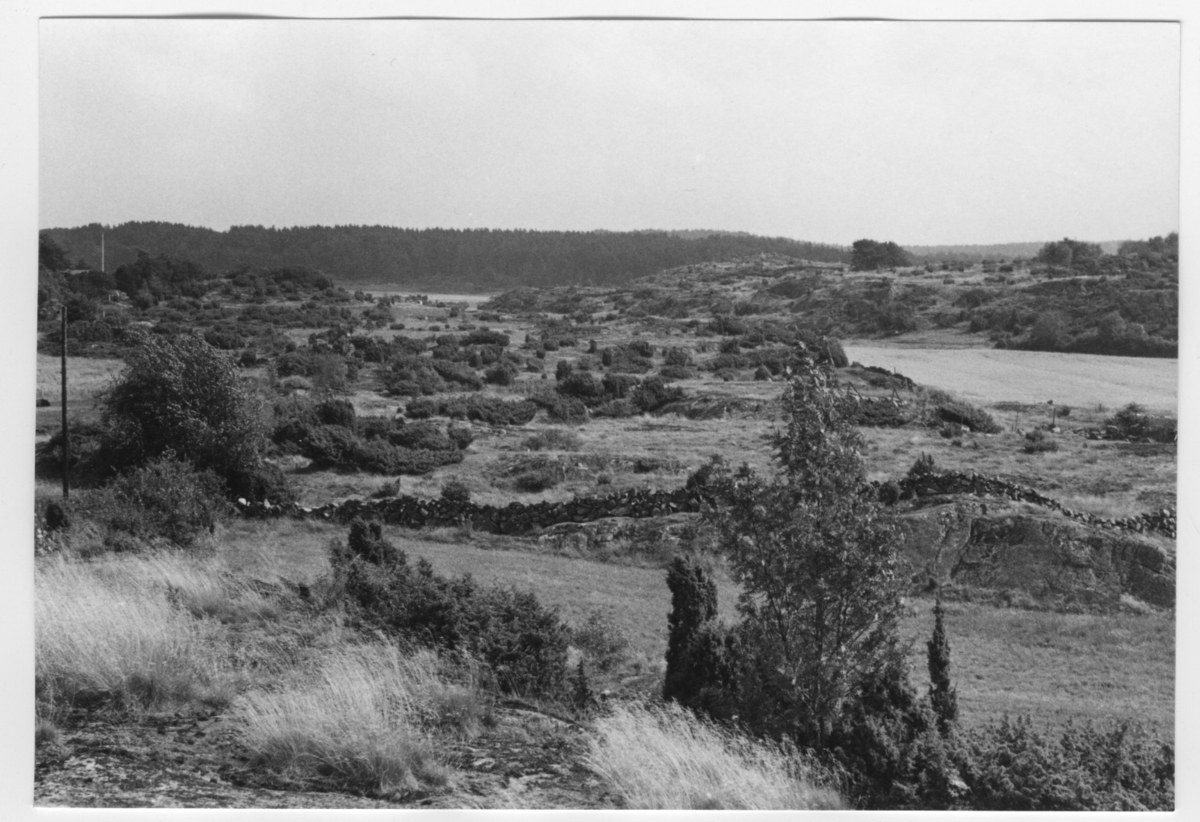'Bildtext: ''Hällandskap. Enbuskvegetation. Riktning 70.'' :: Vy över berghällar med enbuskar och stenmur, till höger skymtar öppet fält, åker och i fonden syns skogsparti. Stengärdesgård. :: :: Ingår i serie med fotonr. 6970:1-1125, dokumentation av Hisingens naturgeografi, visande landskapsformerna i stora drag och gjord inför exploateringen av området. Platserna för fotograferingen finns utsatta på karta i skala 1:4000 som finns på Göteborgs Naturhistoriska musem. Fotoriktningen mättes med kompass i gammalgrader.'