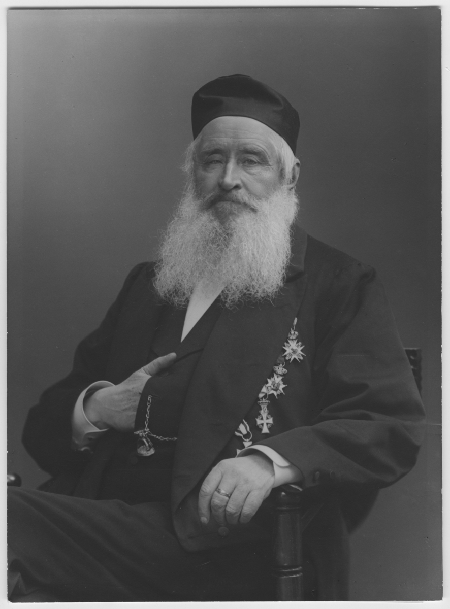 Gerhard von Yhlen - den sista av sin ätt. Det var han, som komponerade och införde vår nuvarande studentmössa. På sin tid agare av Ållonö. Fiskeriintendent på västkusten. Karantänsmästare på Känsö. Porträttet taget på 75-årsdagen. Ovanstående tecknat av kusinbarnet till von Yhlen D. M. Klingspor, Kurreb, Urshult. Iklädd huvudbonad.