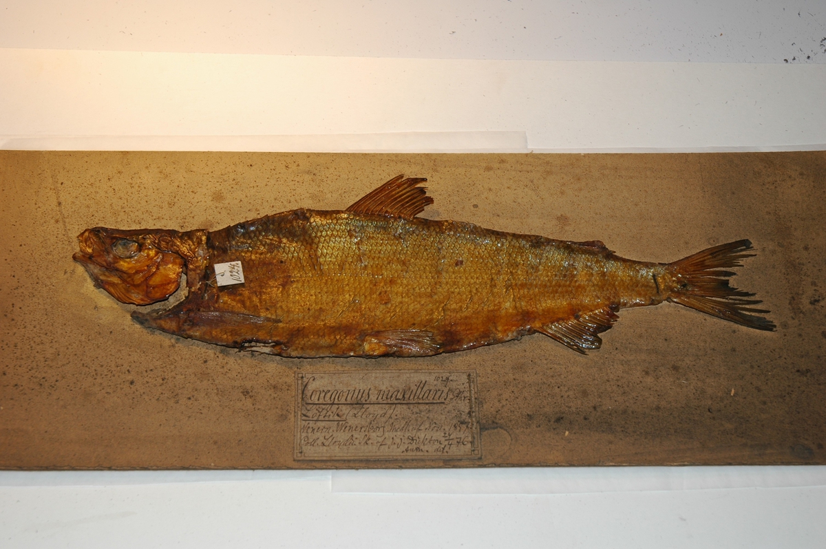 'Torkat skinn av storsik från Vänern år 1857 Pi.su. nr 1024. :: :: Ingår i serie med fotonr. 7005:1-8 med foton av fiskar bevarade genom torkning, framtagna för rengöring av konservator.'