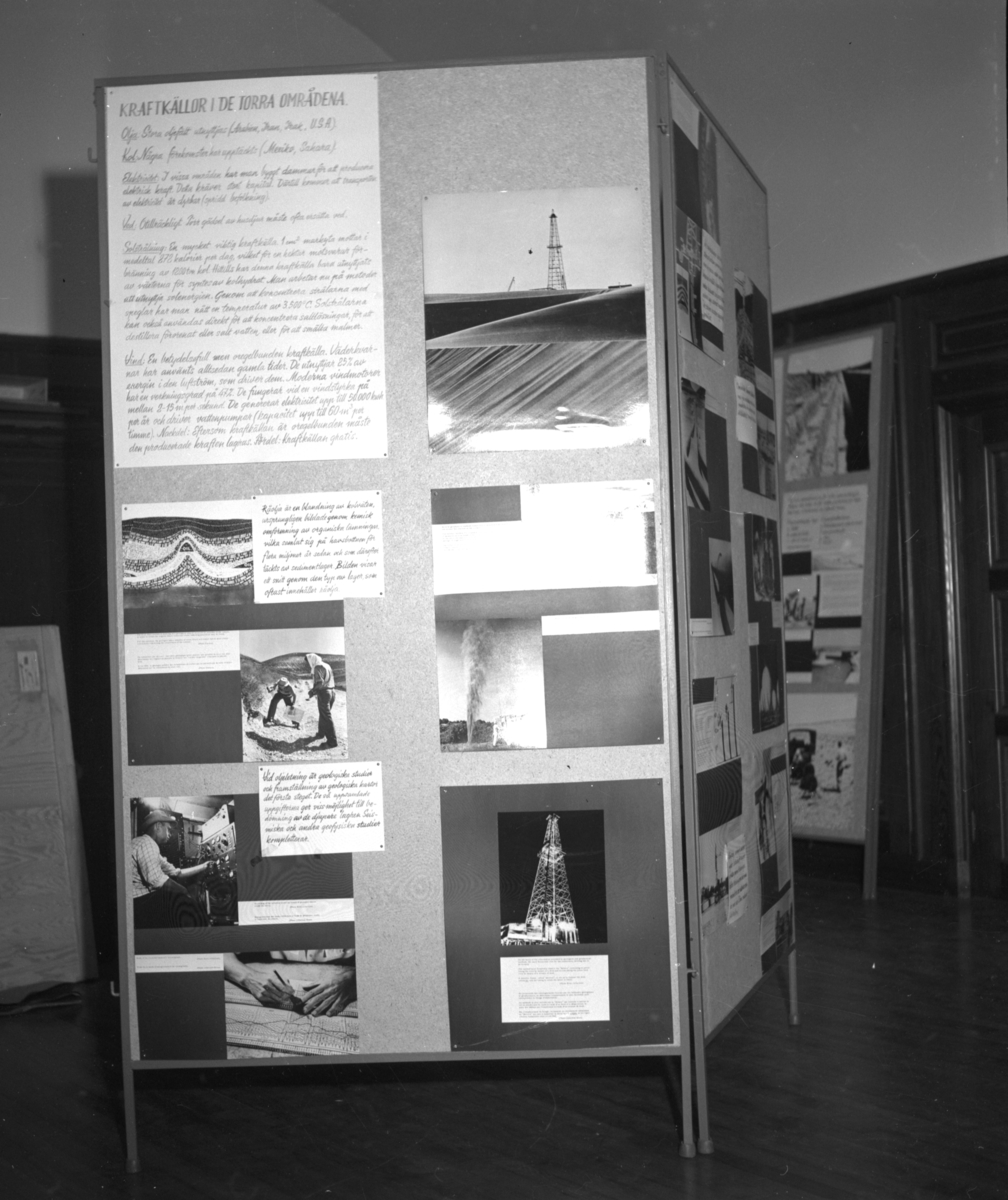 'Uställningen ''Människan och öknen - en utställning presenterad av UNESCO''. :: :: Sektion av utställningsskärm, troligen inne i biblioteket, under arbetet med att sätta ihop utställningen ''Människan och öknen''. Med titel ''Karftkällor i de torra områdena''. :: :: Ingår i serie med fotonr. 6984:1-18.'