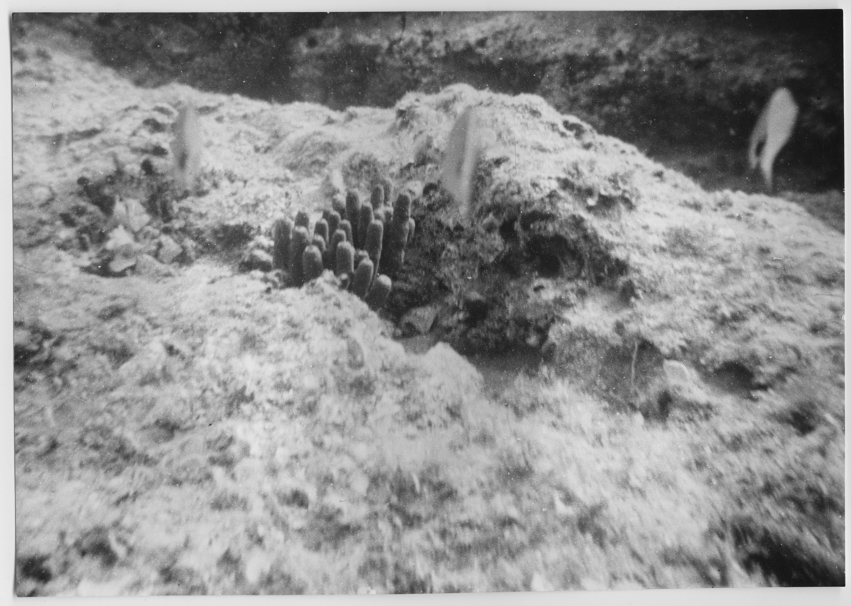 'Text till foto: ''En svampkoloni i övre gränszonen för artens förekomst. Djup omkring 2 meter. Kollonien fanns i en gryta på klippans högsta punkt. Till höger om svamparna, inne i halvskuggan syns 6-7 st sjöborrar.'' :: :: Ingår i serie med fotonr. 6989:1-9.'
