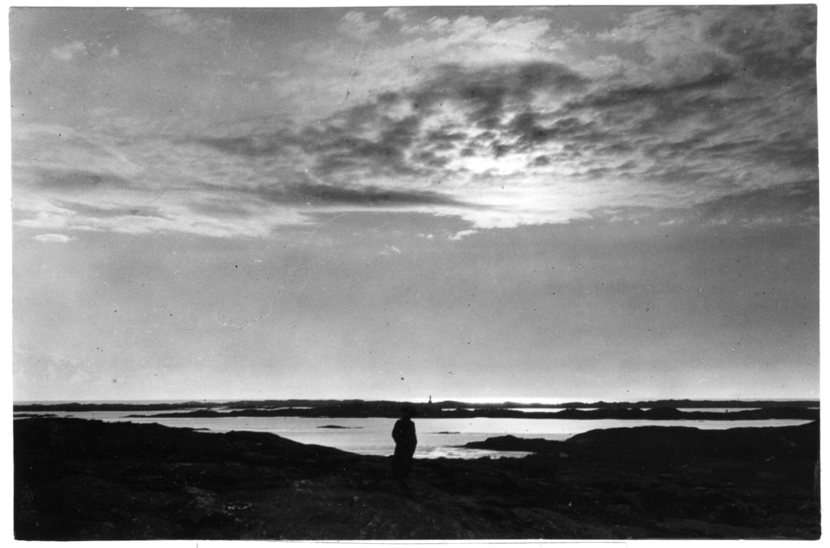 'Bildtext: ''Utsikt från Hästevik över Öckerö.'' Tillagt med handskriven text ''I hela länet 3300 st öar, holmar och skär.'' Vy över havsvik och berghällar, 1 person stående i förgrunden. Ev. fyr på avstånd. :: :: Fotonr. 7046:1-84 indelade som ''Landskapsbilder från Göteborgs- och Bohus län.'' Ingår i serie med fotonr. 7046:1-383, 7047:1-33 och 7048:1-67 med bilder från Länsjägmästare John Lindners bildarkiv.'