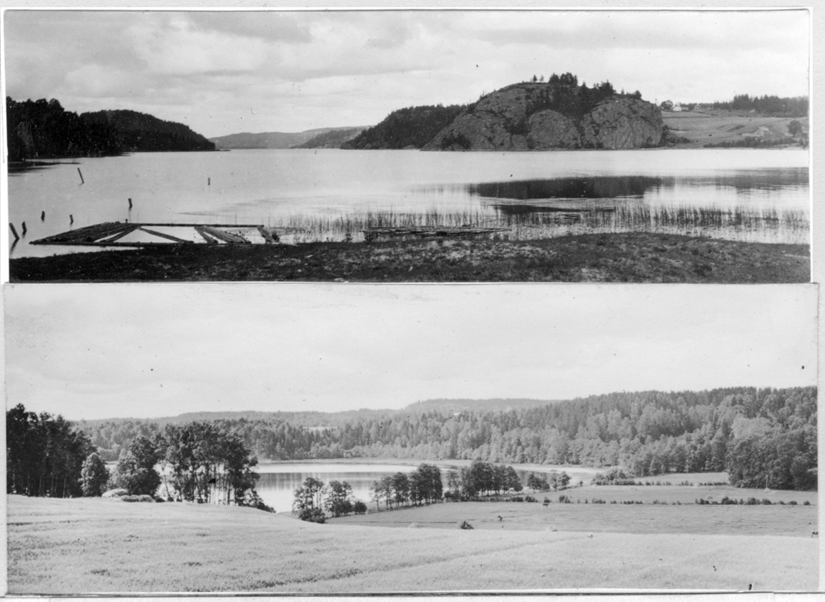 'Bildtext: :: Övre bilden: ''Södra Bullaresjön norrut från Sundshult, till höger Olsborgs berg.'' :: Nedre bilden: ''Vik av Södra Bullaresjön.Tingvall, Naverstads socken.'' Vyer över Södra Bullaresjön med intilliggande berg och jordbruksmark. :: :: Fotonr. 7046:1-84 indelade som ''Landskapsbilder från Göteborgs- och Bohus län.'' Ingår i serie med fotonr. 7046:1-383, 7047:1-33 och 7048:1-67 med bilder från Länsjägmästare John Lindners bildarkiv.'