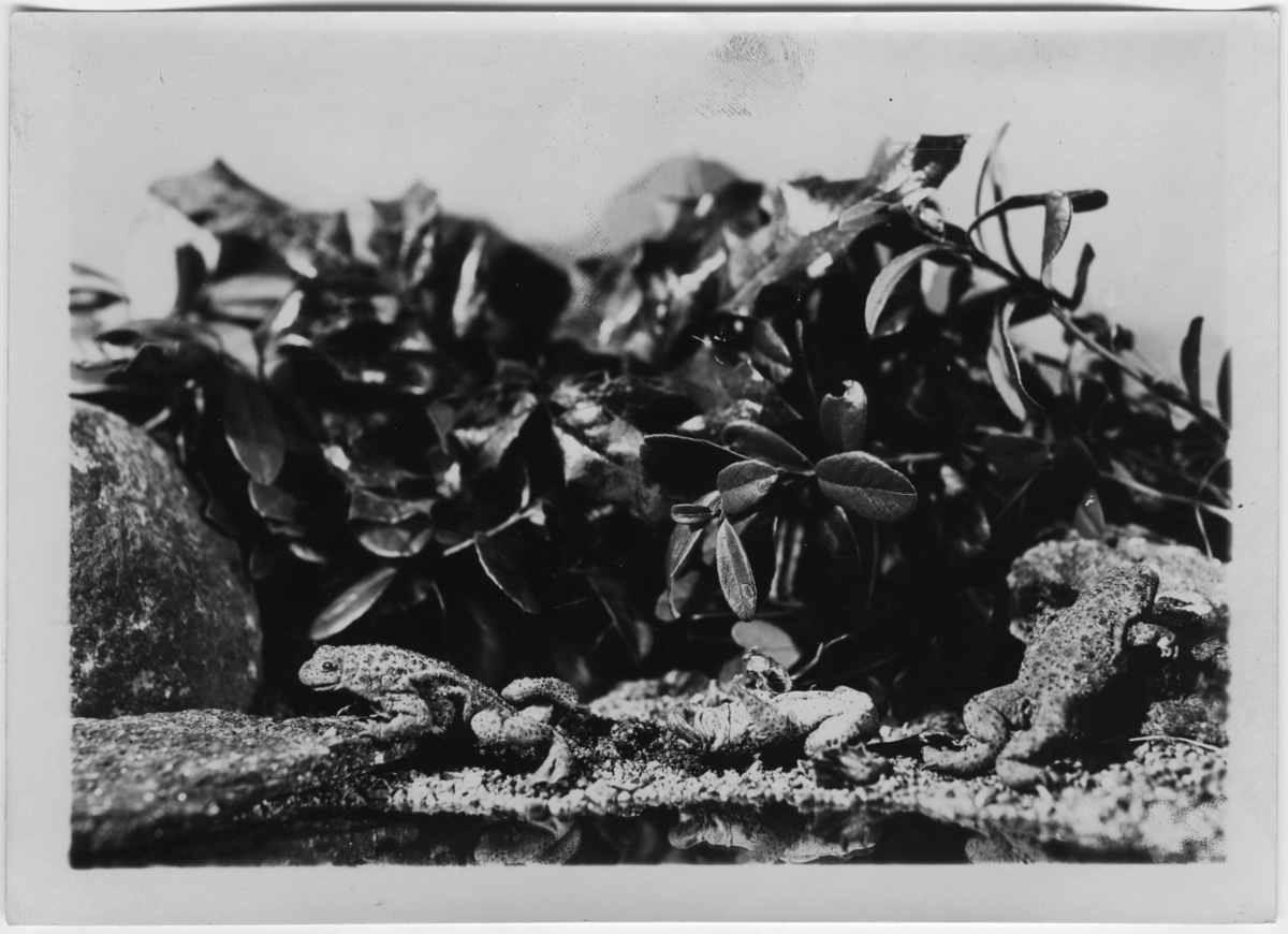 '3 klockgrodor, bildtext: ''Balkanformen av klockgroda.'' :: Ingår i serie med fotonr. 7015:1-91 med bilder av reptiler från Otto Cyréns samling.'