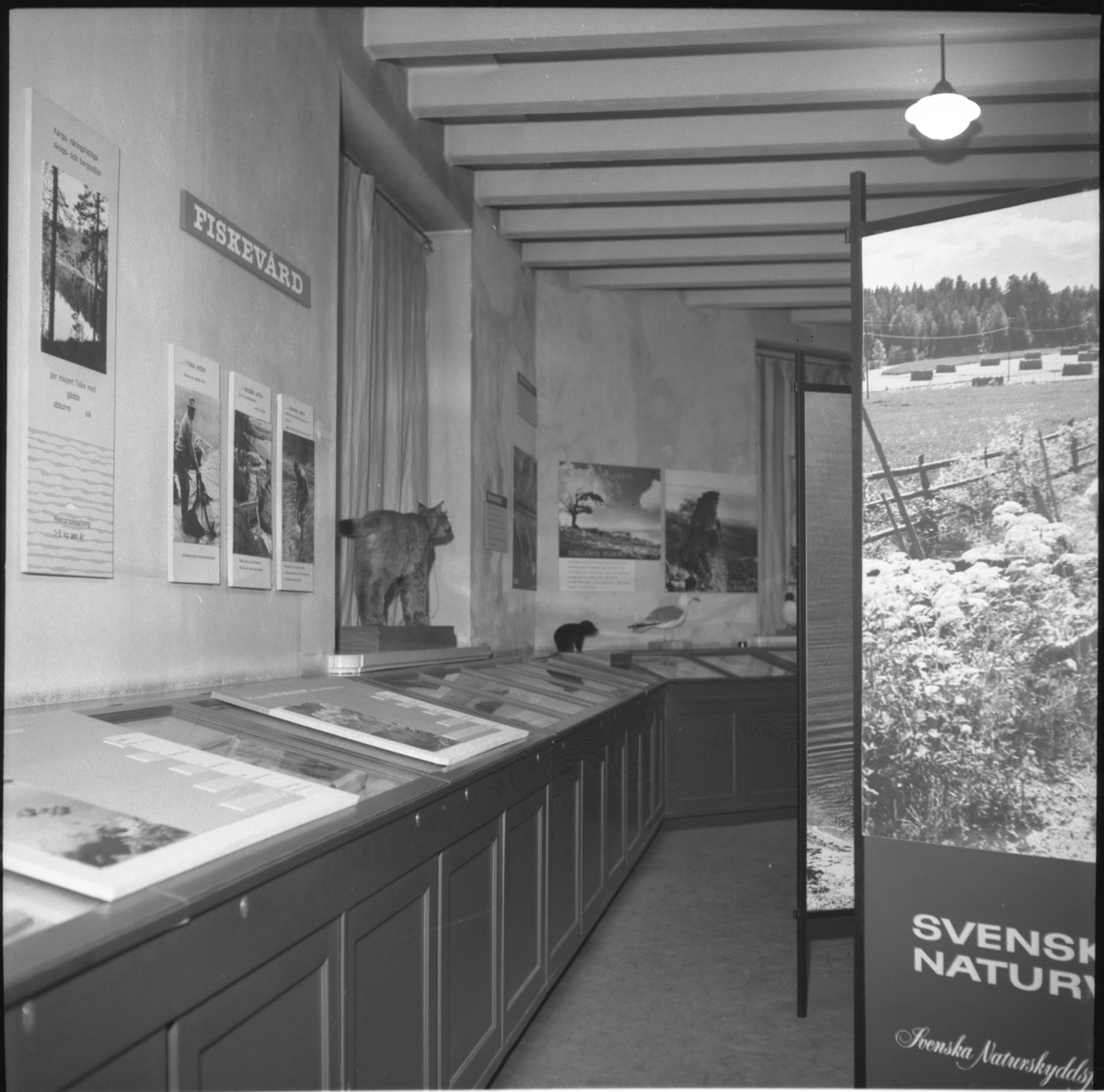 'Utställnngsskärm med titel ''Svensk Naturvård 50 år, Svenska Naturskyddsföreningen'' delvis synlig. Låga montrar i trä med glaslock runt väggen samt på väggen även bilder och text med titel ''Fiskevård''. Monterat lodjur. Bakre väggen med planscher med titel ''Hallands Väderö''. :: :: Ingår i serie med fotonr. 6983:1-22.'