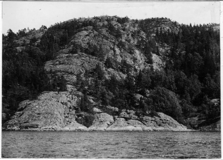 'Bildtext: ''Dragonkullen från Idrefjorden. 163 m.ö.h.'' Vy över delvis trädbevuxen bergvägg med hav farmför. :: :: Fotonr. 7046:1-84 indelade som ''Landskapsbilder från Göteborgs- och Bohus län.'' Ingår i serie med fotonr. 7046:1-383, 7047:1-33 och 7048:1-67 med bilder från Länsjägmästare John Lindners bildarkiv.'