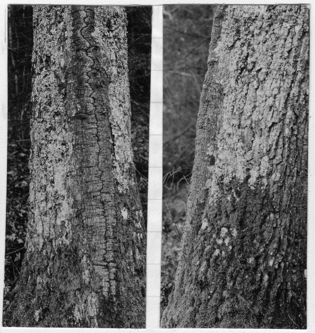 'Bildtext: ''Frostspricka och frostlist på ek.'' Närbild på skador på ekstam. :: :: Fotonr. 7047:2-23 indelad under rubriken ''Atmosfäriska skador på skogen, skogseld och släckning därav.'' Ingår i serie med fotonr. 7046:1-383, 7047:1-33 och 7048:1-67 med bilder från Länsjägmästare John Lindners bildarkiv.'