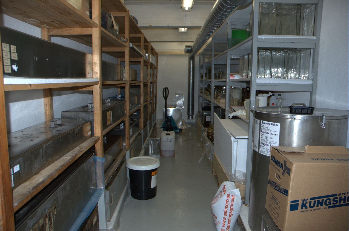 'Spritkällaren med diverse preparat förvarade i behållare med sprit. :: :: Fotonr. 7095 består av en bildserie som dokumenterar diverse utrymmen i byggnaden så som kontor, arbetsplatser, arbetsrum, magasin m.m. Bilder tagna före och efter olika ombyggnationer bl.a.'