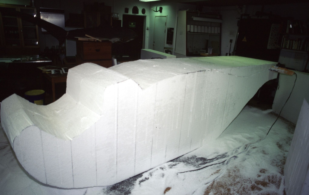 'Grovt utskuren sjökomodell, i cellplast. :: :: Bilder från arbetet med att konstruera en modell av Stellers sjöko utifrån beskrivning gjord av Georg Wilhelm Steller 1742. :: :: Modellen föreställer en ung hona som är nästan 5 meter lång och står utställd längst in i valsalen på Göteborgs Naturhistoriska Museum (2008-0124). :: :: Ingår i serie med fotonr. 7101:1-35.'
