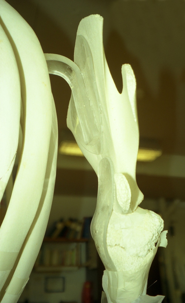 'Monteringsarbetet med näbbvalen, hane, Valders skelett: :: Detaljbild av fenupphängning. :: :: Skelettet till näbbvalen är monterat och hänger i valsalen på Göteborgs Naturhistoriska Museum. Då näbbvalen sågs utmed kusten kom den att kallas Valder i media. :: :: Ingår i serie med fotonr. 7106 med bilder på näbbvalen som levande och under arbetet med att montera skelettet.'
