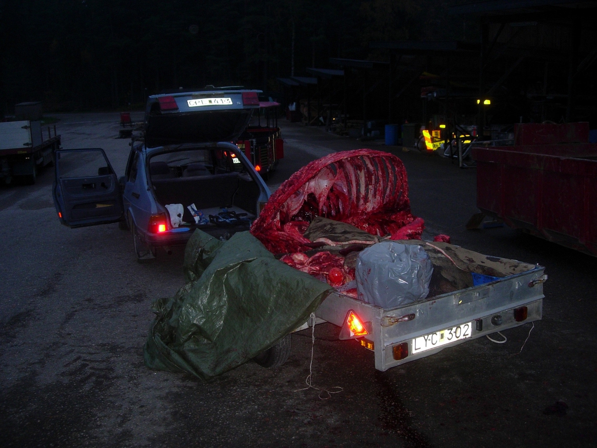 'Vit noshörning, grovskeletterat skelett liggande på bilsläp utanför museet. Död i Borås djurrark. :: :: Ingår i serie med fotonr. 7128:1-8.'
