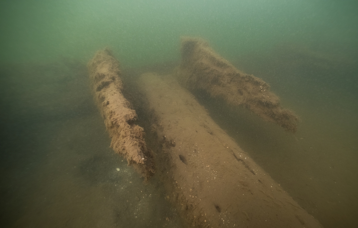 Två knän och en däcksbalk. I bakgrunden, till vänster i bild, kan man skymta innergarneringen som är kraftig i sitt utförande. Till höger syns ytterligare ett knä. Fartygslämning L1978:4814 Fredrik Wilhelm.