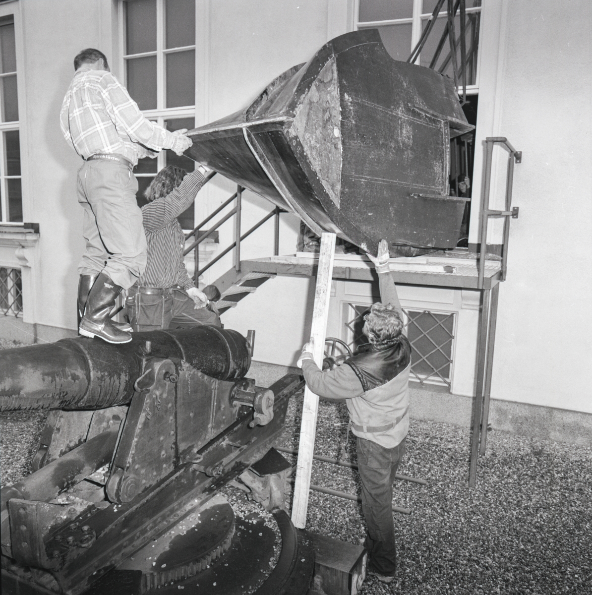 Utställningen "Smuggling". Museets personal arbetar med installering av en båt genom museets fönster inför utställningen om smuggling.