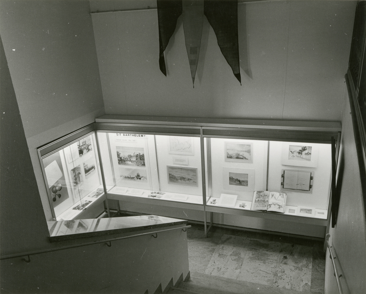 Utställningen "St Barthelemy" i trappmonter. Föremål och arkivarier kopplade till den svenska kolonin St Barthelemy i Västindien.