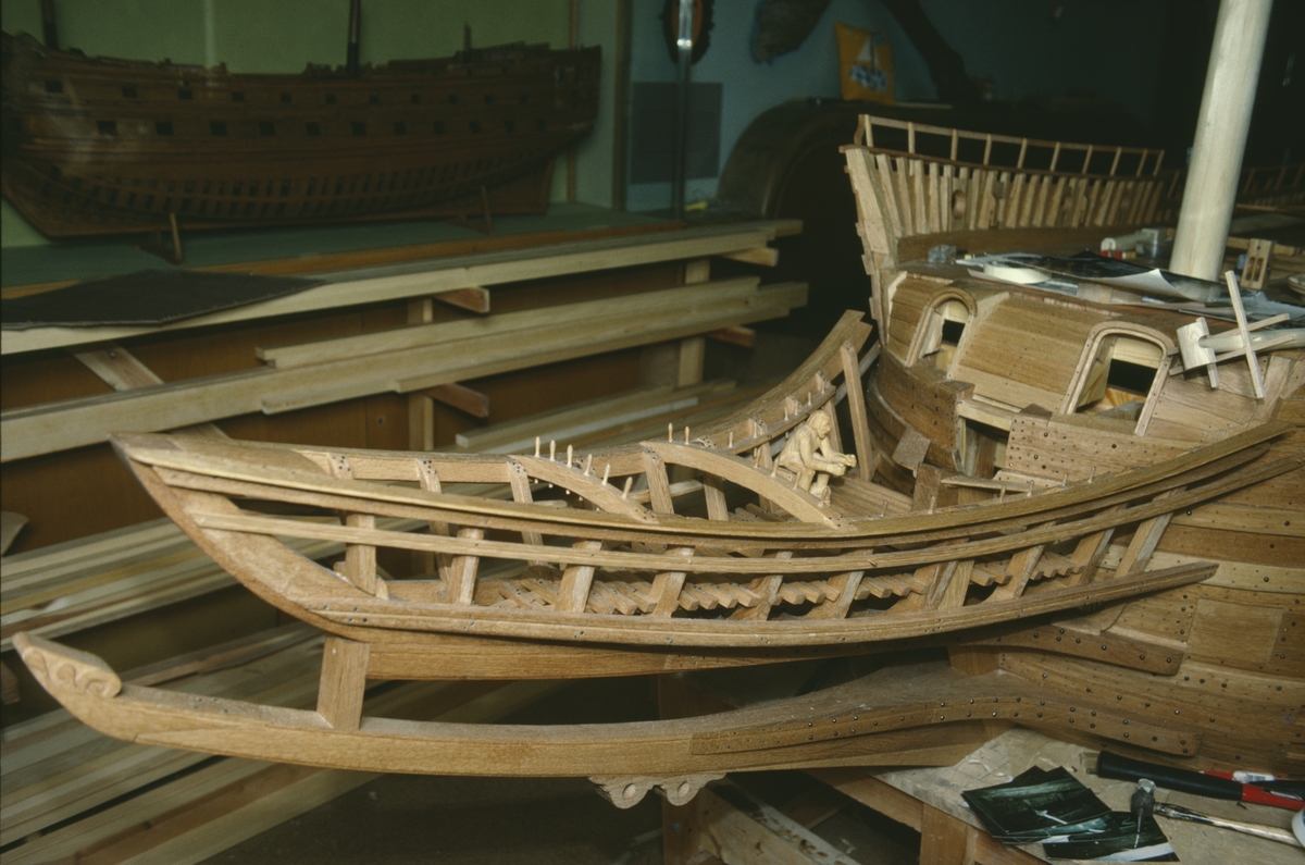 Vasamodellen i skala 1:10 under byggnad. Förstäv, galjon.