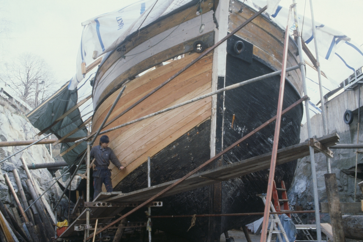 GUNHILD, snickare drevar på nytt utbytta timmer på fartyget som är inne för renovering. Drevjärn och klubba används samt tjärat tvinnat lingarn.