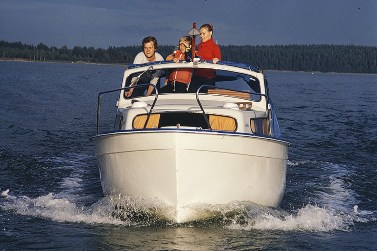 Familj samlad i doghouse på Albin 25. Marknadsföringsbild.