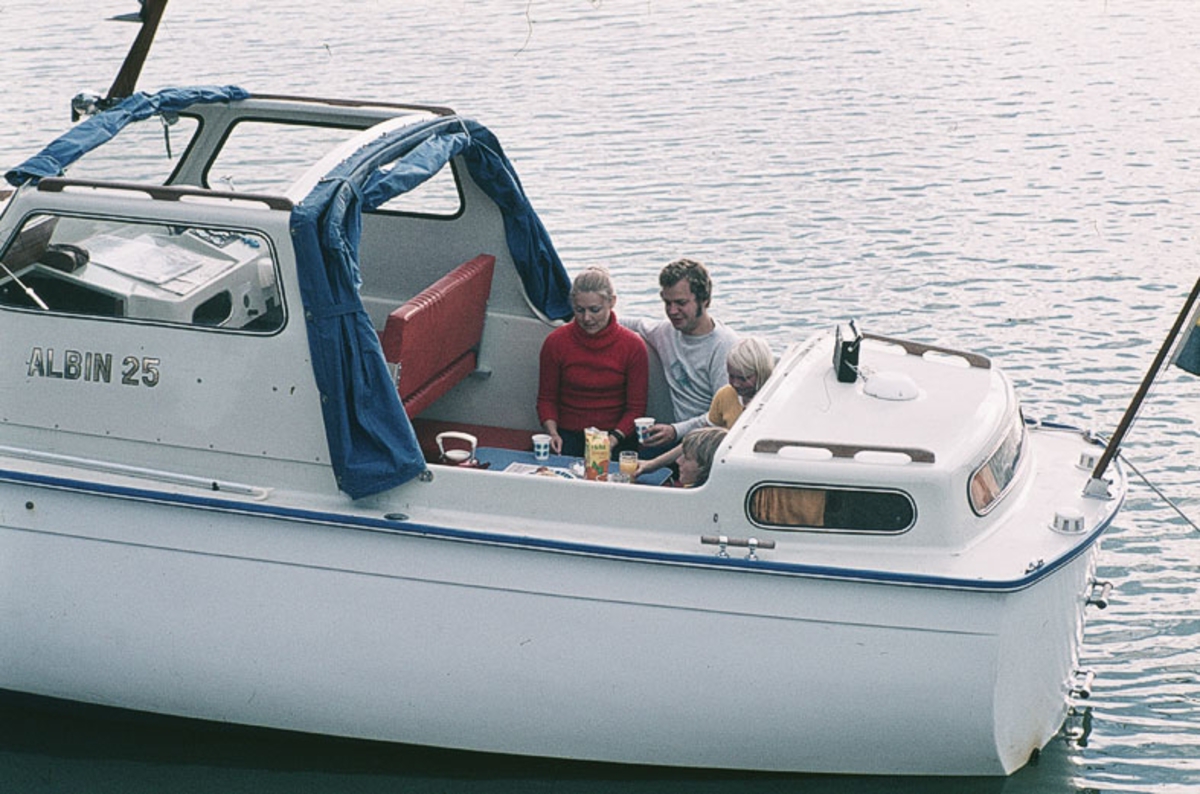 Familj i sittbrunnen på Albin 25. Marknadsföringsbild.