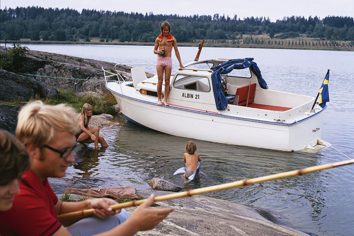 Albin 21 förtöjd i en vik. I förgrunden en man med metspö. Marknadsföringsbild.