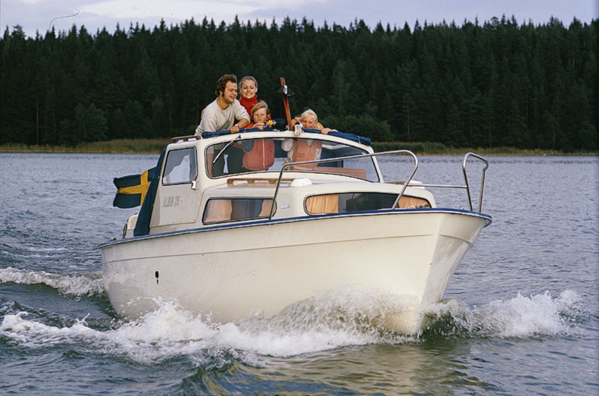 Familj samlad i doghouse på Albin 25. Marknadsföringsbild.