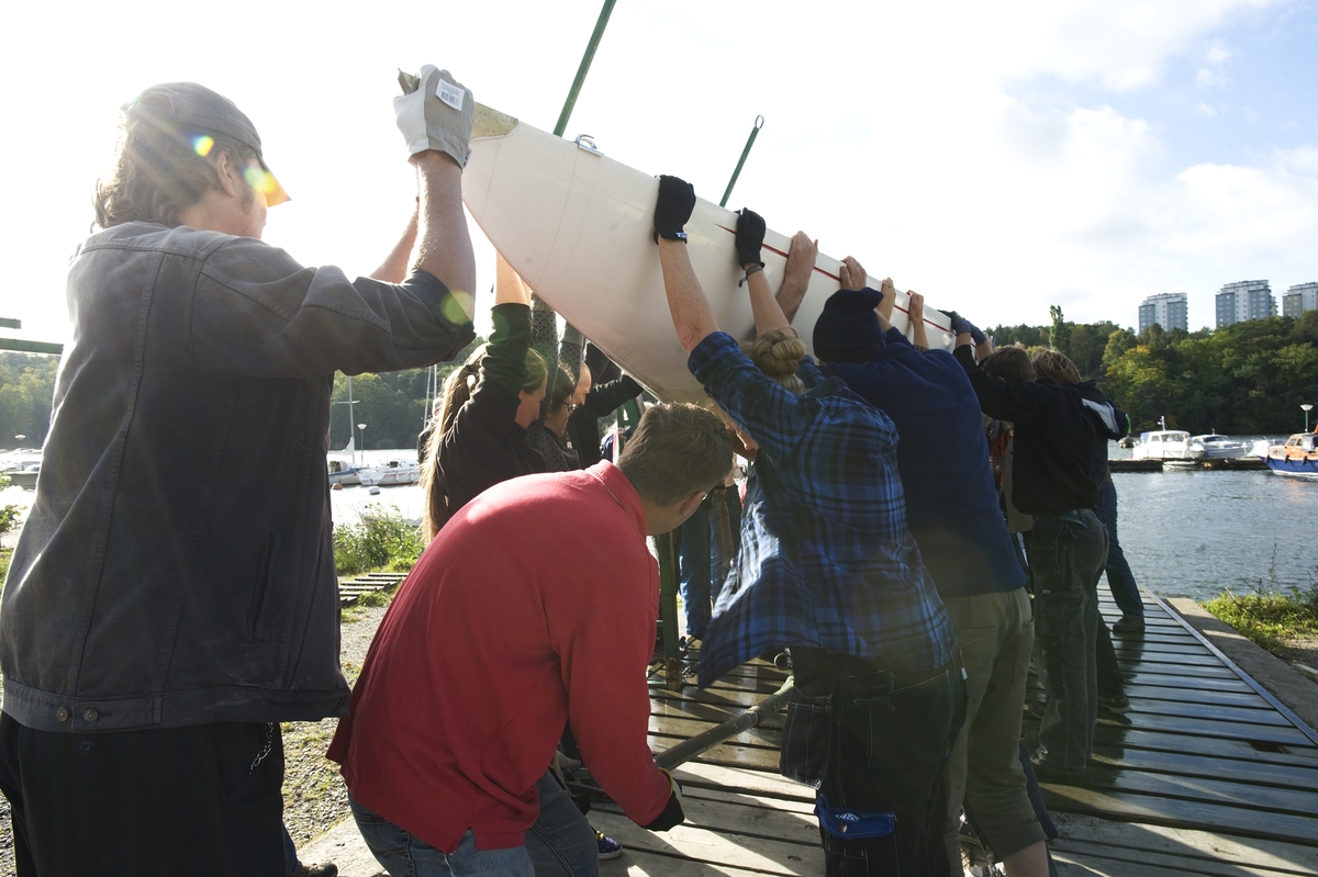 Båtupptagning på gammalt traditionellt vis, med handkraft, på Årstavikens SS vid Eriksdalsbadet 26 september 2009