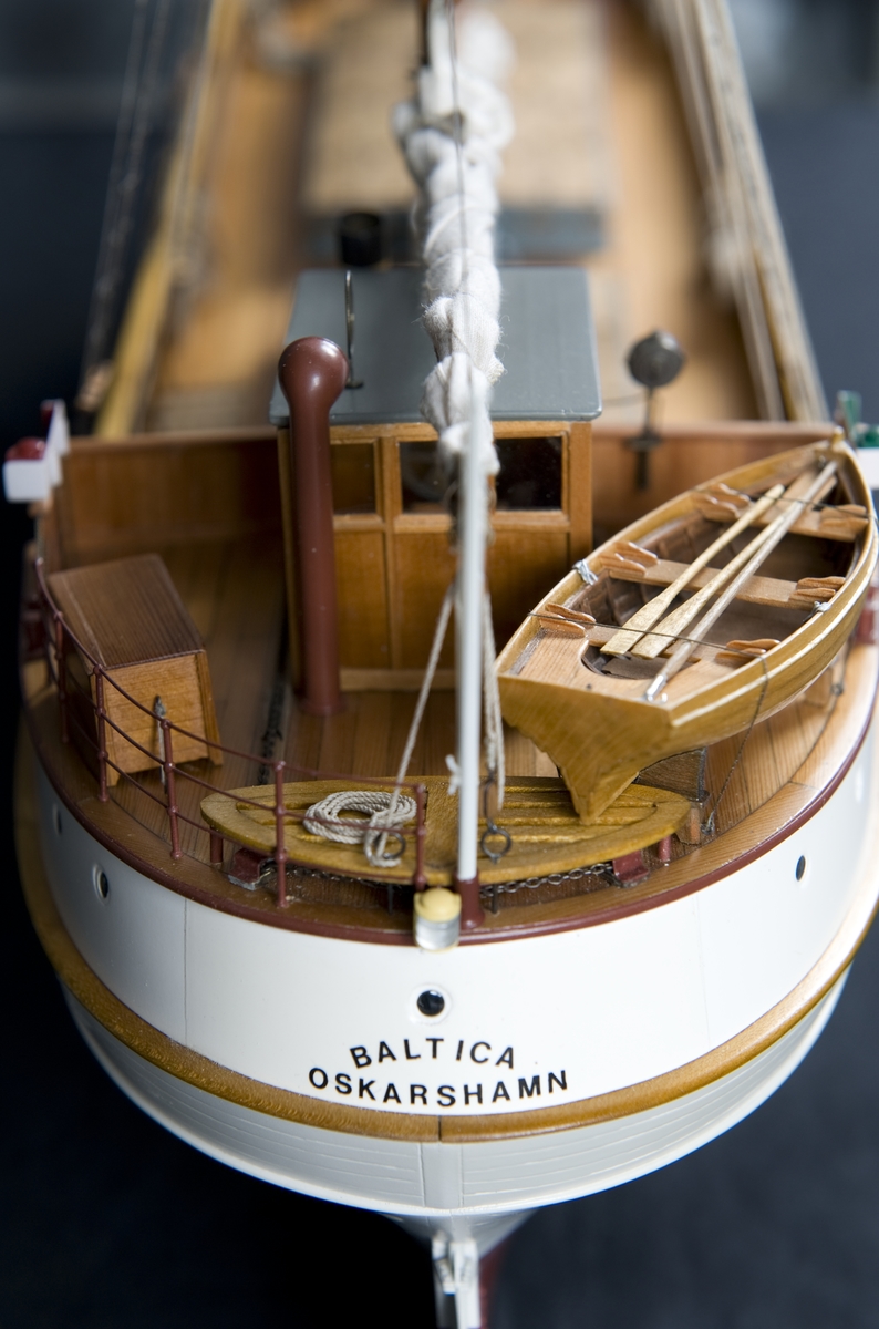 Titel: Detaljbild av modell av tremastskonaren BALTICA, byggd i Sjöhistoriska museets modellverkstad av Stefan Bruhn och Jan Claesson