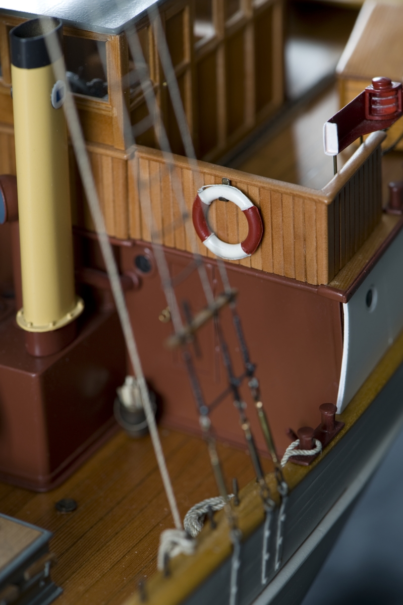 Detaljbild av modell av tremastskonaren BALTICA, byggd i Sjöhistoriska museets modellverkstad av Stefan Bruhn och Jan Claesson