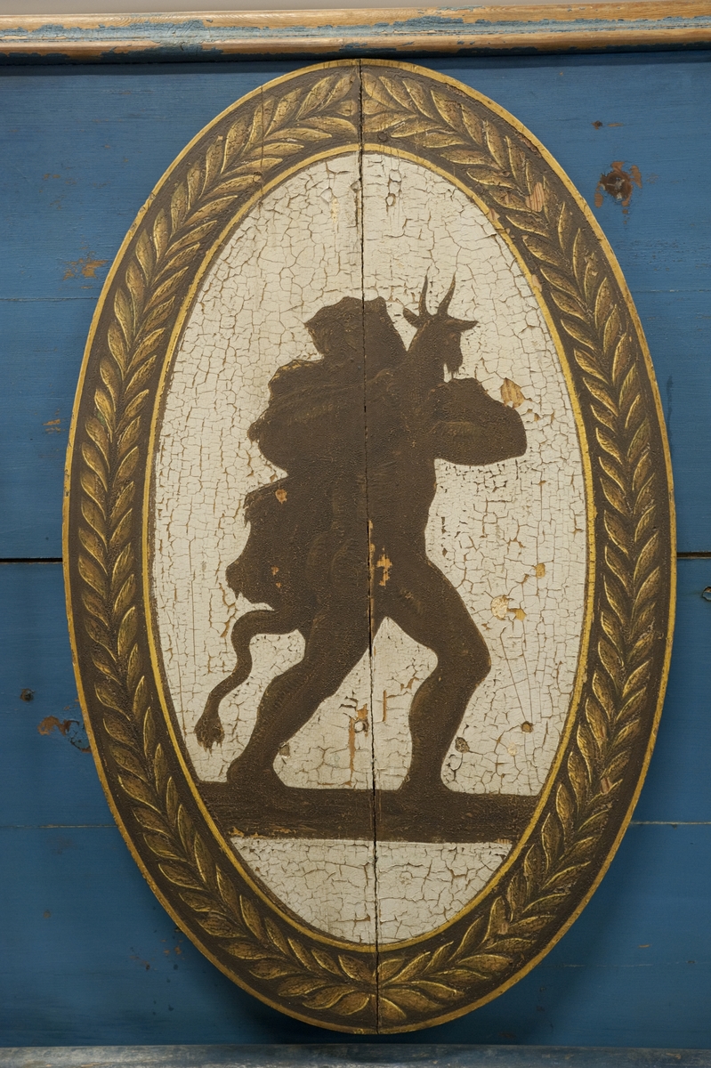Sköld med antikt motiv på sidan av den kungliga slupen DELFINEN.
