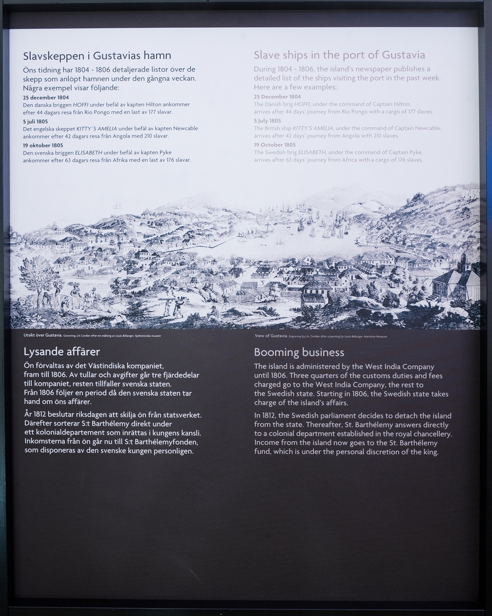 Vandringsutställningen "En dunkel historia" om den transatlantiska slavhandeln. Skylt med utställningstext.