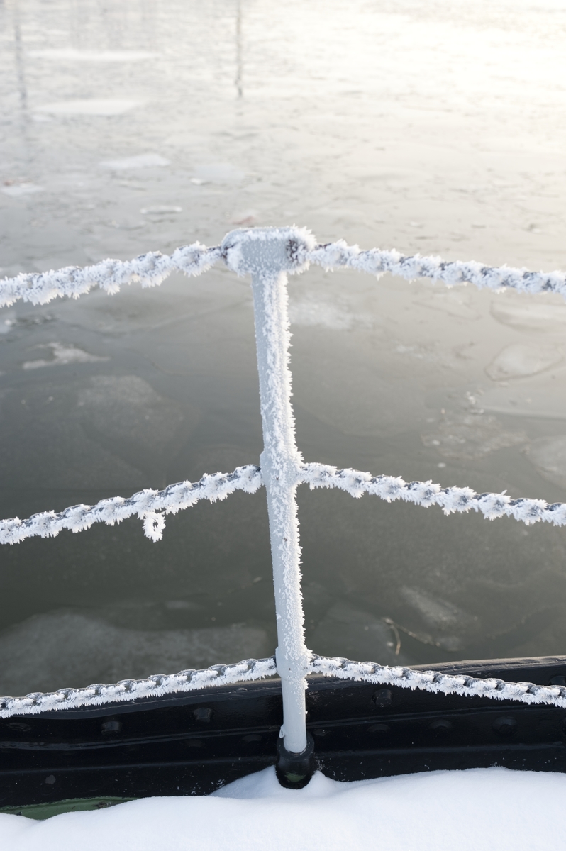 Isbrytaren Sankt Erik. Detalj av reling täckt av rimfrost.