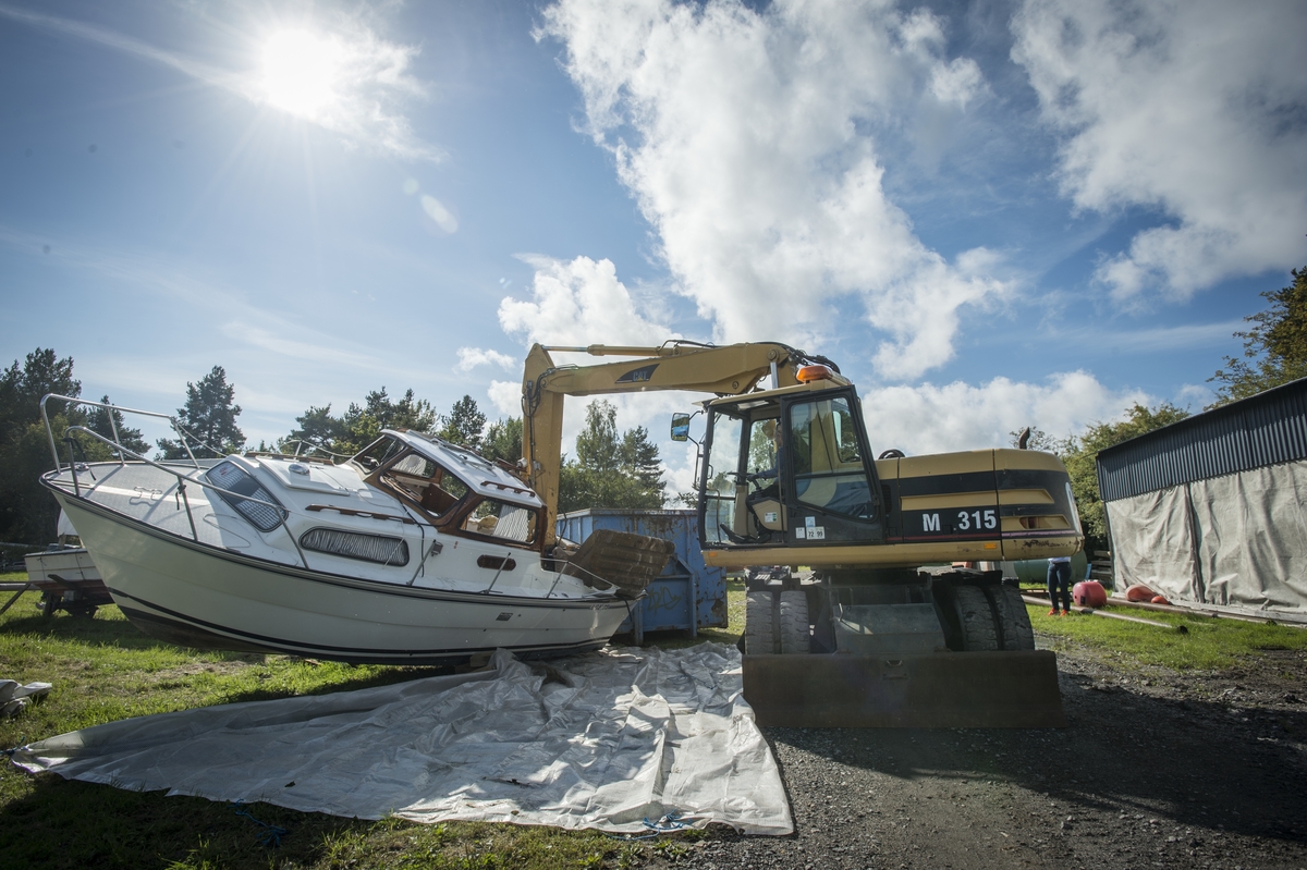 Företaget Båtskroten demonterar och skrotar en äldre plastbåt.